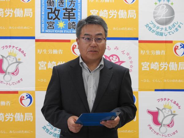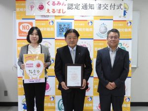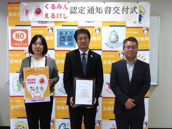 宮崎労働局(吉越正幸局長)は9月29日、宮崎市内で「くるみん・えるぼし認定通知書交付式」を開催した。くるみん認定を取得した株式会社サンライズネットワークスと、えるぼし認定を取得した▽丸昭建設株式会社▽都北産業株式会社▽大和開発株式会社▽株式会社クラフ―の4社に対して、吉越局長が認定書を手渡した。