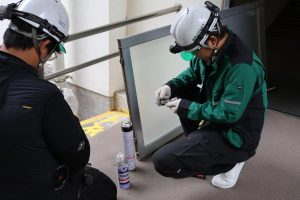 参加者は、学校からの要望や事前に会員が行った点検結果を踏まえ、作成したチェックリストを確認。北校舎・南校舎・体育館の各持ち場に分かれて、開閉しづらくなったドアや窓の状態を確認しながら、アルミサッシの建付調整や戸車の交換、クレセント錠の取替、ビスの増し締めなどを行った。