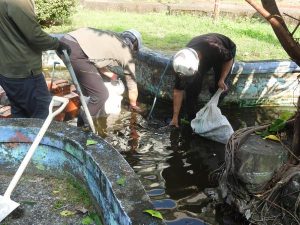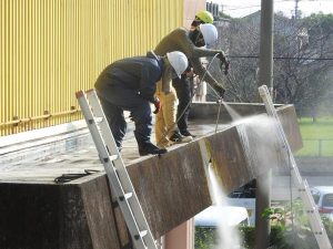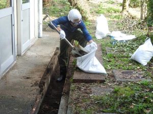 開始式後には、事前に学校と打ち合わせを行っていた担当者が作業内容や注意事項を説明し、各自の持ち場に別れて作業を開始。構内の側溝に堆積した土砂をスコップで除去するとともに、亀が生息している池の清掃や樹木の剪定、建物屋上のドレン周辺に生えた雑草や土砂等の除去、体育館入り口の庇の高圧洗浄などを行った。