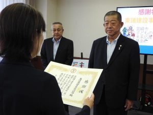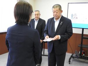 贈呈式で藤元代表理事は、「未来を担う子ども達のため、有効に活用してもらいたい」と挨拶。これに対して袈裟丸副市長は、「本市の児童福祉に深い理解を示し、子ども達の未来を応援する趣旨から多額の寄付をいただいた」と感謝状を贈り、「子ども達の健やかな成長のために、大切に使わせていただきたい」と述べた。