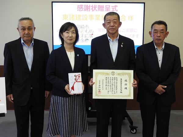 生コンクリートの製造・運搬を手掛ける東諸建設事業協同組合(藤元建二代表理事)は、組合の設立60周年を記念して、宮崎市の「子どもの未来応援基金」に50万円を寄附した。10月16日に藤元理事長と金子勝生理事、渡辺勝広専務理事が宮崎市役所を訪ね、袈裟丸未央副市長に寄附金の目録を手渡した。