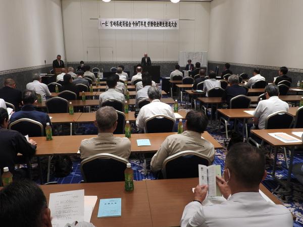 来賓挨拶で宮崎労働局労働基準部健康安全課の中玉利浩治課長は、建設業では依然として、墜落・転落災害や重機災害といった従来型の労働災害が繰り返し発生していると指摘。研修会や安全大会を通じて安全意識の高揚を図り、日々の安全衛生活動を充実させることで、会員会社から災害が発生しないよう努めてもらいたいと述べた。