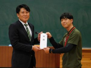 寄贈式の開催に先立ち、コマツカスタマーサポート株式会社の篠宮努氏が研修生に対して、ハーベスタシミュレータによる造材研修やスマート林業への取組等について講義を行った。