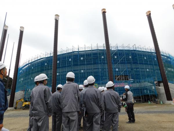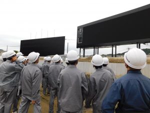 また、電気設備工事を請け負う三桜電設株式会社の小田直申氏と川崎康平氏がそれぞれ工事の概要や進捗状況を説明。説明後には、両氏から説明を受けながら、受変電設備や発電設備、夜間照明設備やスコアボード設備など、施設内の施工状況や設備を見学した。