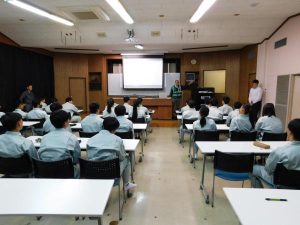 出前講座では、宮崎県支部の普及委員長を務める嶋末武氏が、塗装が美観だけではなく、紫外線や風雨等から構造物を守る保全の役割も果たしていること、現場の条件や素材に応じて塗り方や塗料を使い分けていることを説明。現場の第一線で活躍する若年塗装技能士が、仕事の魅力ややりがいについて語るVTRを鑑賞した。