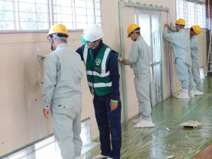 体験学習では、県北地区の会員企業に所属する塗装技能士が指導役として参加し、経年劣化で色あせた体育館や管理棟の壁の塗り替えに挑戦した。生徒達は、熟練技能士から養生やパテを使った下地処理の手法、溜まりのない綺麗な塗り方などを学び、刷毛やローラーを使って、自らの手で建物を綺麗に塗り替えた。