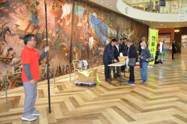 キャンぺーンでは、「11月1日は警備の日」と銘打ったのぼり旗を掲げながら、会員がそれぞれの持ち場に分かれて、通りを行き交う買い物客らにリーフレットやポケットティッシュ等を配布したほか、防犯用具である「さすまた」の展示や警備業界の紹介動画などを放映しながらPR活動を行った。