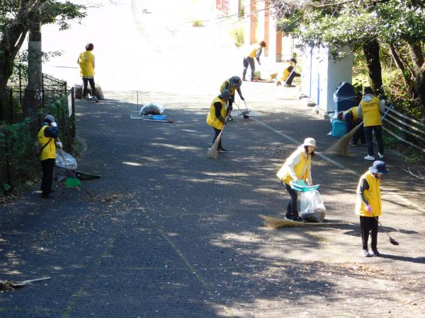 参加者は、清掃器具やゴミ袋を手に作業場所へと移動。展望台広場周辺や遊歩道、駐車場などで、竹箒・熊手等を使って落ち葉やゴミを丁寧に拾い集めた。落ち葉等でいっぱいだった公園内は、作業終了後にはスッキリと綺麗になっていた。