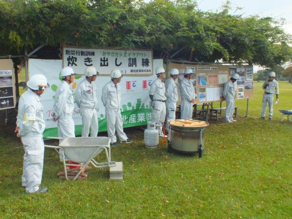 都城市の都北産業株式会社(堀之内秀樹代表取締役)は11月2日、都城市山田町のかかしの里で、大規模災害の発生を想定した「炊き出し訓練」を開催した。同社の従業員やその家族ら155人が参加し、真剣な表情で訓練に取り組む姿が見られた。