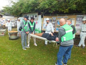 続いて、災害時に物資が少ない中での非常食の準備方法や被災者の搬送方法を担当者が解説。現場にある手押し車を利用したお米の炊き方や長椅子を用いた怪我人の搬送方法などを学んだ。炊き出し訓練で使用した250食分の非常用米は、懇親会時に配られた。