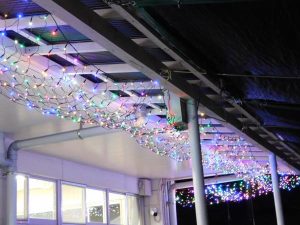 部員達はネットタイプのLEDイルミネーションやサンタクロースなどをモチーフとした電飾を、施設の軒下や屋外のフェンス等に飾り付けた。協力しながら作業を進める中、子ども達が設置作業の模様を興味深く笑顔で見つめていた。