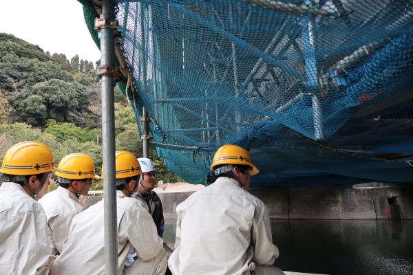 施工を手掛ける大淀開発土木部の前田淳現場代理人は、具体的な工事の内容や現在施工中の鋼橋上部工について説明。3Dデータを用いた完成予想図を示すとともに、現場内の吊り足場の様子を間近で見学した。