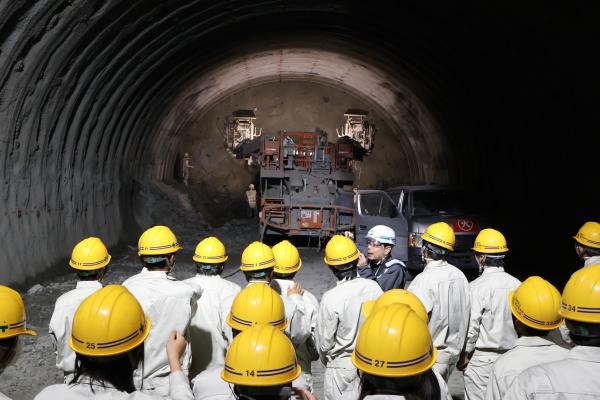 その後、トンネル内部の各所を紹介しつつ、掘削作業が進行する最前線まで移動。同時刻に行われていたダイナマイトによる発破掘削の迫力を間近で体感した。普段体験することができない工事の様子に、生徒達からは歓声が上がった。