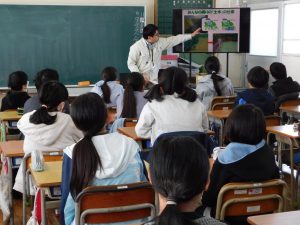 出前講座では、土木が地形に合った工事の進め方を考え、空気や水、生き物が暮らす場所を汚さないように気を付けて、皆が気持ちよく暮らせる街を造っていることを説明。「土木の仕事は皆の生活を守るやりがいのある仕事。少しでも興味や関心を持ってもらえれば嬉しい」と話した。