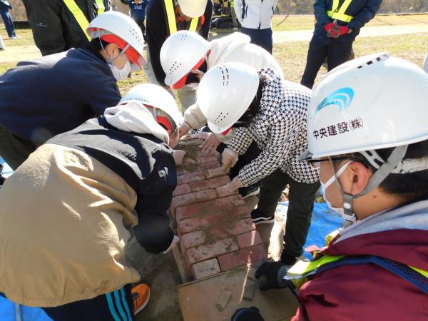 体験学習では、パトロールカーの見学や高所作業車への試乗、バックホウを使った模型の魚釣りや棒倒さないゲーム、レンガと砂を使ったアーチ橋造り、測量機器での距離当てゲームに挑戦した。生徒たちは、初めて触れる重機や機器に興味を示し、楽しみながら土木とふれあった。