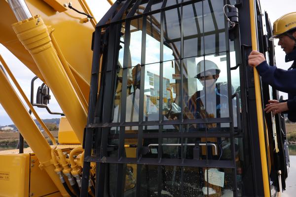 コマツ宮崎株式会社が協力した試乗体験では、ICT搭載のバックホウに生徒達が試乗。同社営業本部ソリューション推進グループの岩永亮氏と横山滝馬氏が、ICT建機と通常建機の違いを説明し、操縦者の負担軽減や安全性向上といったメリットを紹介した。