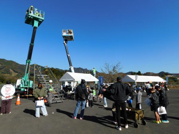 高千穂地区建設産業団体連合会と宮崎県、高千穂町、日之影町、五ヶ瀬町が主催する「土木の日ふれあい祭り2025」が、11月29日に高千穂町コミュニティセンター裏駐車場及び自然休養村管理センターで行われた。多数の親子連れが来場し、建機の試乗や土木にちなんだイベントに挑戦するなど、親子で土木とふれあった。