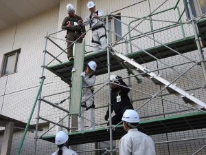 建築大工技能士会は、断熱ボードの採寸・カット・はめ込み作業を指導。左官技能士会は、コテを使って手作業で珪藻土の塗り壁を仕上げる手法を説明し、コテを上手に使ってパターン付に挑戦する生徒の姿も見られた。とび技能士会は、足場の仕組みや役割を解説し、足場上での部材の移動や組立作業に挑戦した。
