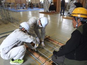 型枠技能士会は、コンクリート構造物を建設する際、コンクリートを流し込むために型枠が必要であることを説明し、熟練技能士の指導のもと、生徒達が型枠の建て込みを体験した。鉄筋業組合技能士会は、建物や構造物を補強するため、コンクリートとセットで内部に鉄筋を組み込むことを解説し、鉄筋の結束に挑戦した。