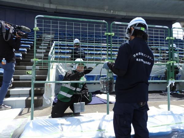 一般社団法人日本塗装工業会宮崎県支部(堂地隆一支部長)と宮崎県鋼橋コンクリート構造物塗装協同組合(堂地隆一理事長)は、4月8日と9日の2日間、宮崎県総合運動公園のひなたサンマリンスタジアム宮崎で塗装ボランティア活動を行った。両団体の会員企業から2日間で約70人が参加し、スタンド席の手すりの再塗装に汗を流した。