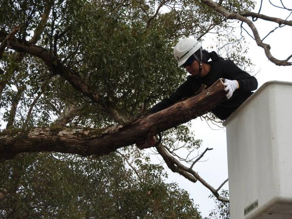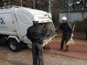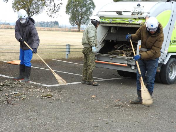 作業手順や注意事項を確認した参加者は、各自の持ち場に移動して作業を開始。国富町運動公園では、野球場のナイター照明を阻害していた樹木の高枝を伐採し、同町内の球技場では、施設利用者の安全確保のため、駐車場の樹木の枯れ木を撤去した。綾城周辺では、トリマーや刈り込みバサミを使って庭木を整え、薬剤を散布した。