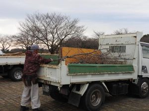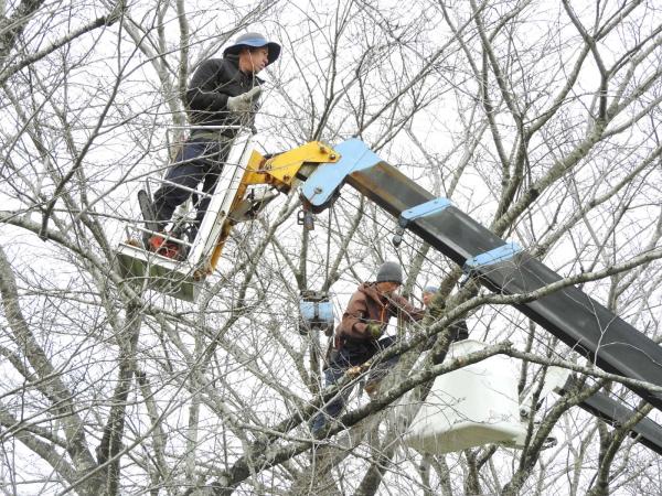 作業では、敷地内の駐車場付近を中心に、梯子や高所作業車、チェーンソーなどを使用して、内部に空洞が生じた幹の撤去、てんぐ巣病を発症した枯れ枝の除去を実施し、除去した枝をトラックに積み込んだ。寒空の中、参加者は黙々と作業に取り組んだ。