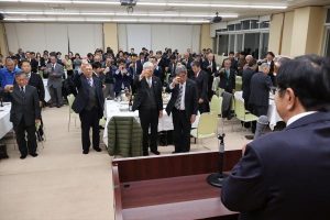 その後、宮崎県農業協同組合えびの市地区本部長の小吹敏博氏の乾杯の発声で開宴し、参加者は各テーブルで会食や歓談を楽しんだ。祝宴では、豪華景品があたるお楽しみ抽選会が行われるなど、会場は大いに賑わいを見せた。祝宴後には、労働安全衛生協議会の平水錠司会長の発声に合わせて、参加者全員で万歳三唱を行った。