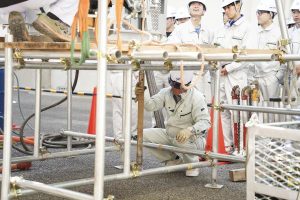実習体験では、宮崎県の新技術活用システムに登録されているリチウムバッテリー式LED投光器「フラワーライト」をはじめ、工事用信号機、縦型UD電光盤、ソーラー式監視カメラシステム「みるかめくん」、舗装工事の作業工程、地質調査、根入れ・ボーリング・平板載荷試験などを見学。舗装工事を実際に体験する学習も行った。
