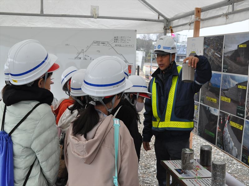 また、自身が海外で取り組んだプロジェクトを紹介し、海外でも日本の高度な土木技術が活躍していることを説明。土木は、人々に安心・安全に暮らしてもらいたいといった「やさしさをカタチにする仕事」であり、持続可能な社会の構築に向けた一翼を担っていることを強調し、「興味があれば将来は建設業で働いて」と呼び掛けた。